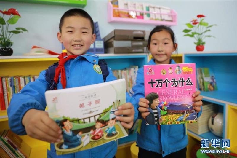 4月22日,在蘭州新區(qū)第二小學(xué),孩子們展示收到的新書。
