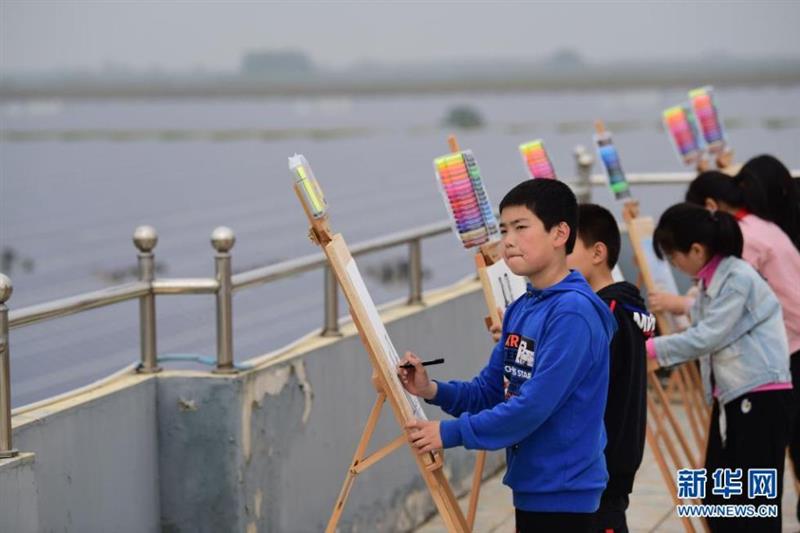 5月12日,在江蘇淮安金湖縣塔集鎮(zhèn)光伏發(fā)電站,銀涂鎮(zhèn)中心小學(xué)學(xué)生在老師的指導(dǎo)下進(jìn)行繪畫(huà)創(chuàng)作。