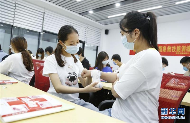 7月29日,大學(xué)生在邢臺(tái)市襄都區(qū)學(xué)習(xí)創(chuàng)傷包扎。近年來(lái),河北省邢臺(tái)市襄都區(qū)紅十字會(huì)面向社區(qū)群眾、學(xué)校師生、企業(yè)員工等群體開展心肺復(fù)蘇、創(chuàng)傷止血包扎等自救、互救課程,增強(qiáng)群眾的應(yīng)急處置能力。截至目前,已開展培訓(xùn)40場(chǎng),覆蓋約3000人次。新華社發(fā)(張馳 攝)