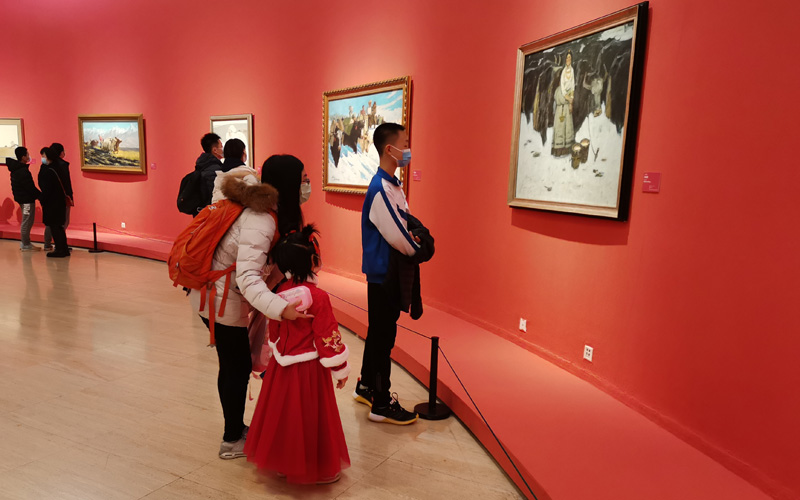 節(jié)假日是觀展旺季。春節(jié)長假期間,中國美術(shù)館網(wǎng)上參觀預(yù)約幾乎全部約滿。館里正在展出的“美在耕耘——中國美術(shù)館2021新年大展喜迎瑞?!碑斎沼瓉砹诵履甑牡谝徊ㄓ^眾,美術(shù)館中人頭攢動,其中有很多小觀眾,他們在長輩親友的帶領(lǐng)下,或認真參觀作品、或席地臨摹,美術(shù)館中充滿了學(xué)習(xí)參觀的氛圍。