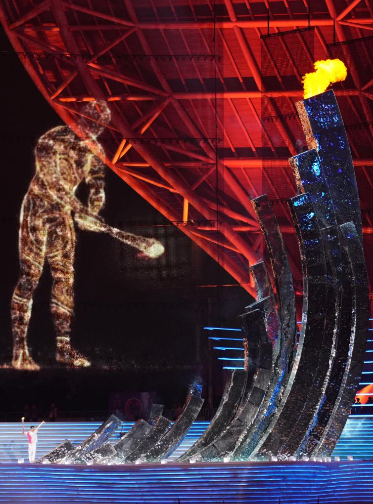 10月8日,數(shù)字火炬人“弄潮兒”在閉幕式上奔跑。新華社記者 黃宗治 攝