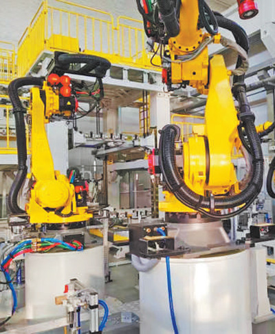 ??河北保定長城精工自動化工廠,5G—A汽車柔性產(chǎn)線上,龐大的機械臂吸起汽車頂蓋,空中盤旋一圈,便涂抹完頂蓋上的膠條,一套動作行云流水。