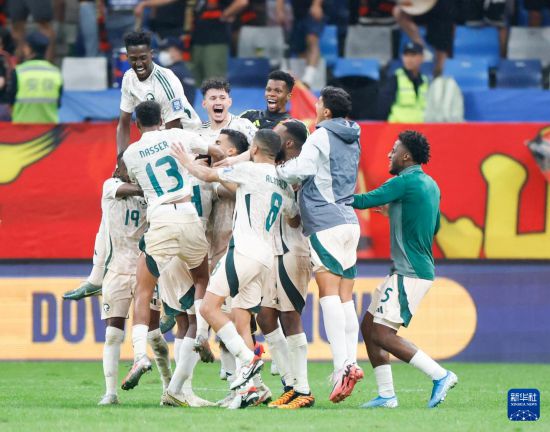 9月10日,沙特隊(duì)球員在比賽中慶祝絕殺進(jìn)球。新華社記者 曹燦 攝