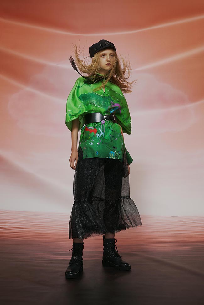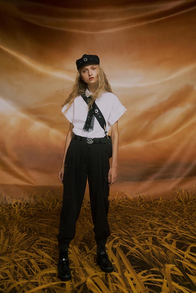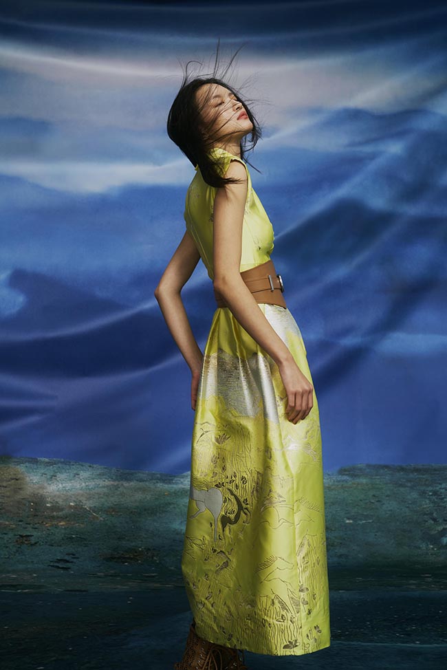 本季從開場軍綠與卡其帶出軍裝元素,展現(xiàn)出木蘭踏上征途的勇氣及決心; 中段以大量黑白為基底,結(jié)合了獨家開版緹花以及手工刺繡圖騰,象征著沿路的風景以及心境上的轉(zhuǎn)變; 結(jié)尾則以迸發(fā)的色彩如正黃色、漸層的鮮綠以及粉紅、熒光桃粉,結(jié)合涂鴉印花,詮釋著經(jīng)歷一切后,一個女人生命旅程軸線的轉(zhuǎn)變,以及擁抱希望與未來的光輝。