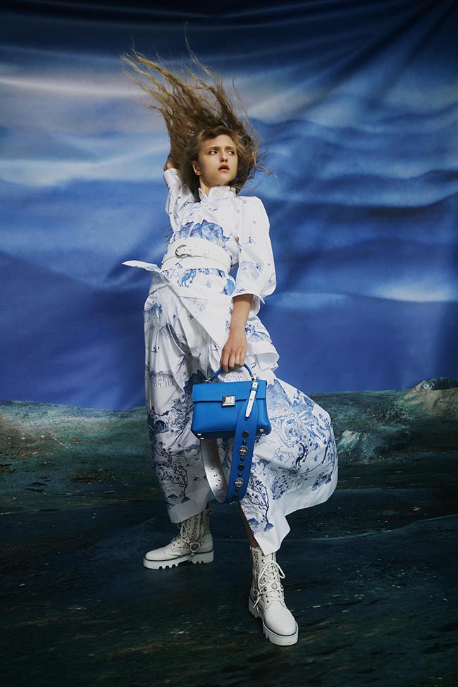 另外,鞋履在本季的設(shè)計中加入馬具的概念延伸,推出短筒軍靴和平底涼鞋,皮帶與釘扣的搭配裝飾十分搶眼,鞋后跟仿劍鞘的皮帶扣飾呼應(yīng)軍旅風格,側(cè)邊的窗欞圖紋除了透氣的功能外也是品牌經(jīng)典的配件元素,整體雖展現(xiàn)出剛強氣息卻妝點了幾分優(yōu)雅柔美。