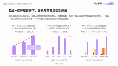 近三年,天貓國際進口營養(yǎng)品消費規(guī)模持續(xù)上漲,2020年消費規(guī)模較2019年增長50%以上,年輕的90/95后父母對嬰幼兒營養(yǎng)品消費高度重視。