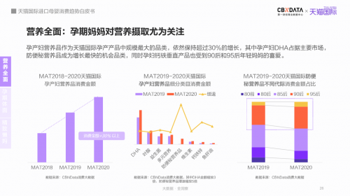 孕期的營養(yǎng)攝取成消費熱點。2020年,天貓國際進口孕產婦營養(yǎng)品消費金額增長30%以上,在多種細分營養(yǎng)品類目中,DHA需求最廣,占據主要消費規(guī)模;防便秘營養(yǎng)品受年輕孕婦媽媽喜愛,在營養(yǎng)品消費中增速最快。
