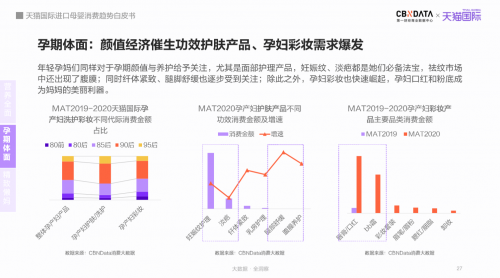 CBNData《報告》顯示,近三年孕產婦相關用品消費金額和消費人數均持續(xù)高速增長,孕婦營養(yǎng)品消費規(guī)模領先于其他類別。年輕媽媽們追求精致,帶來孕產婦護膚、彩妝產品與產后修復儀器消費的高速增長。